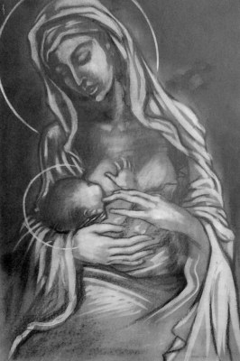 Yet, it is not what this image implies about human sexuality that drew me to it in the Sisters of Charity gift shop. What draws me to this sketch is what it says about who Jesus was and who we are as the Imago Dei (image of God). Of course, Mary must’ve nursed Jesus. Plastic baby bottles and latex nipples filled with formula based on cow’s milk or soy did not yet exist. Jesus’ mother provided the nourishment if mother’s milk. She used her body to provide a necessity of life to the Galilean who became the One who would be resurrected and worshiped two-thousand years later.