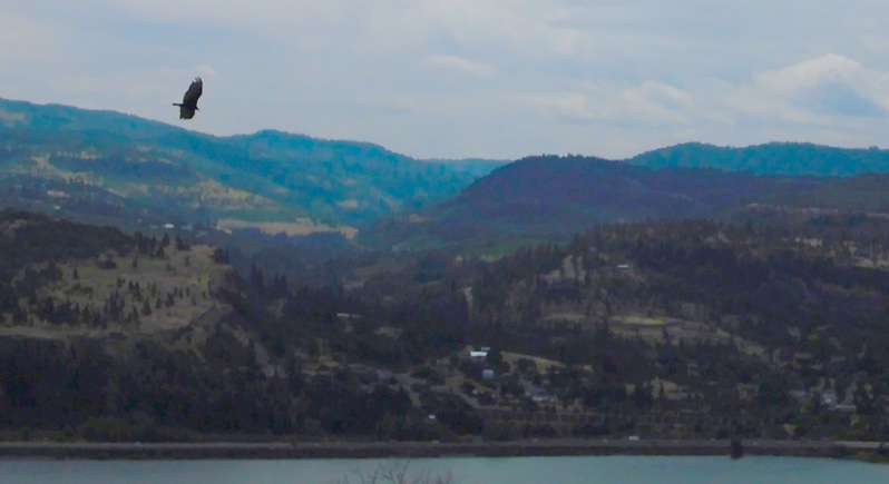 Their broad, protective wings surround me in the the sky above the tiny Oregon town in which I live. I’ve seen them – as many as seven in number – surveying the town when I return home in the early evening. In the early morning I’ve seen them circle in a spiral to the surface of the river to catch a fish. When the winds for which the Columbia River Gorge is famous, bring out human windsurfers and kiteboarders, these magnificent birds can be seen rising thousands of feet above colorful kites and sails to catch the wind currents. Watching, they seem to float in mid-air in even the most powerful gale.