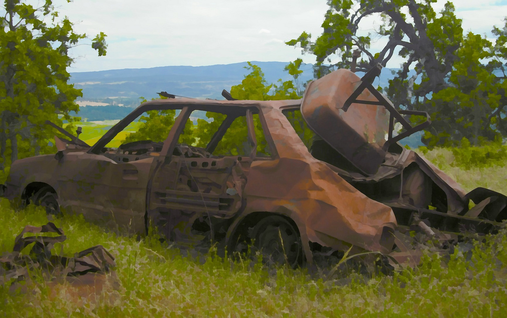On another hike, I came across a burnt out Subaru in a clearing. A wheelbarrow was jammed into its rear window. In that case, however, there was a road near enough that it could’ve been driven in and torched.