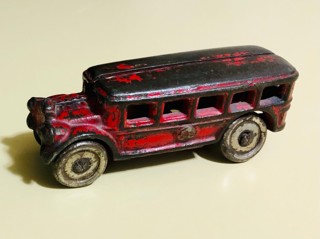 Wrapping my aging adult hands around the cast iron toy bus, I move out of my body and into an inexplicable sphere. I feel the soft squishy child’s hand in my own. It is as if my hands cover and simultaneously inhabit her hand.